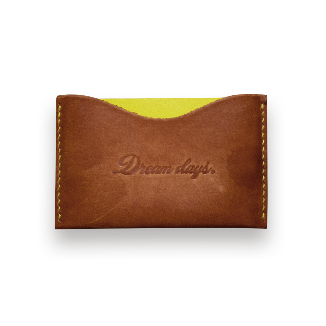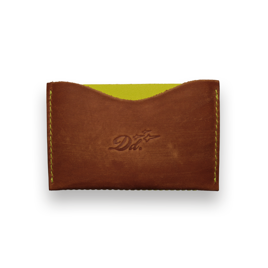Billetera de cuero cosida a mano con separador en tela color amarillo neón. Contiene por un lado nuestro logo largo y por el otro el corto.