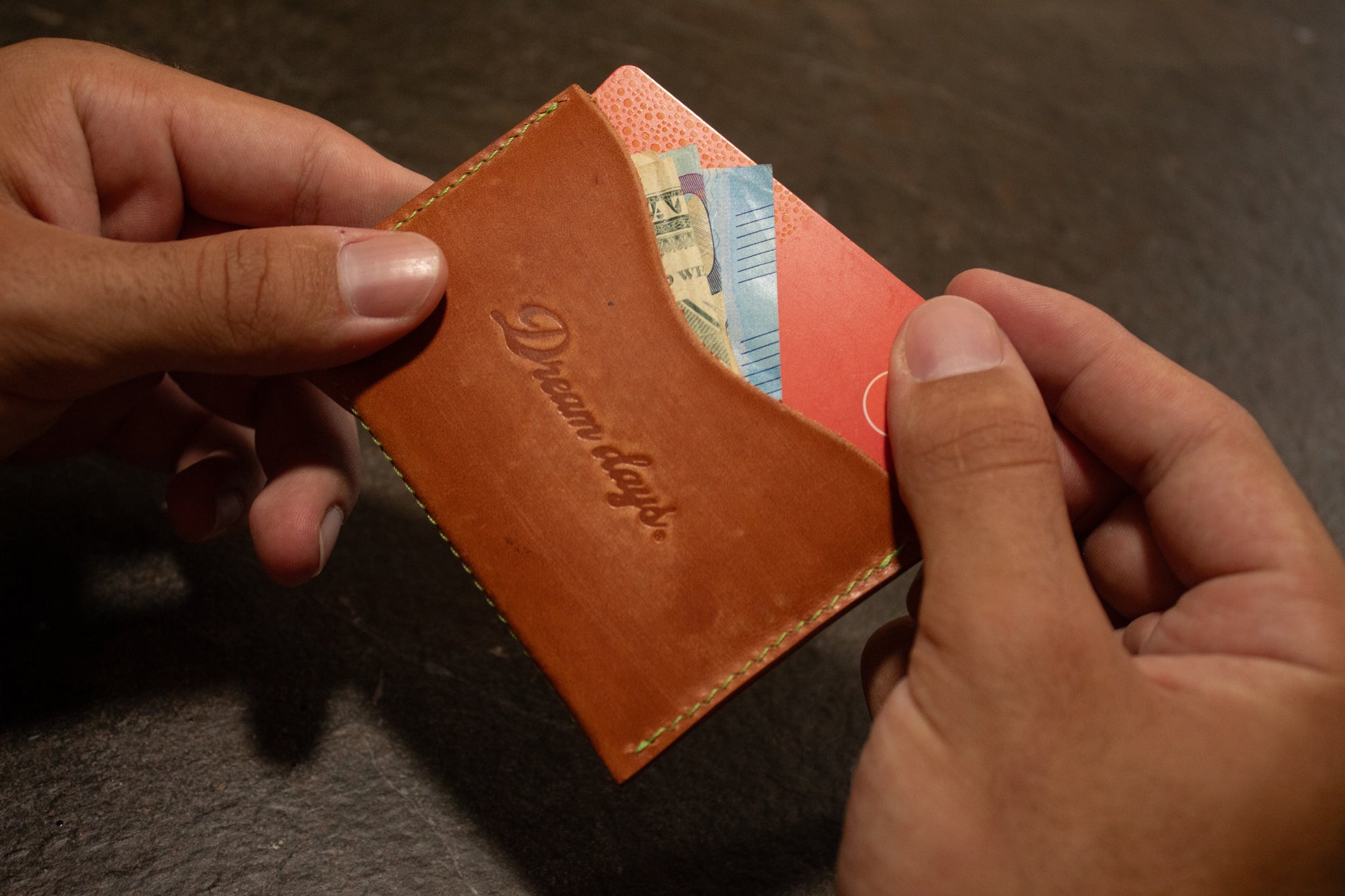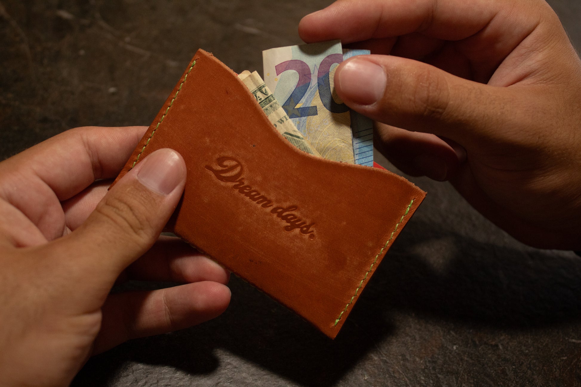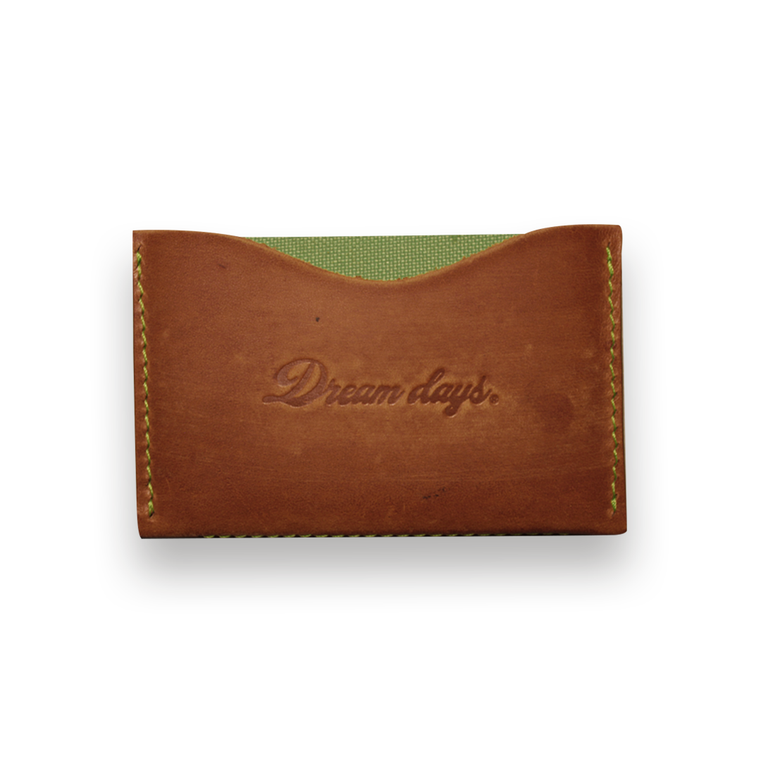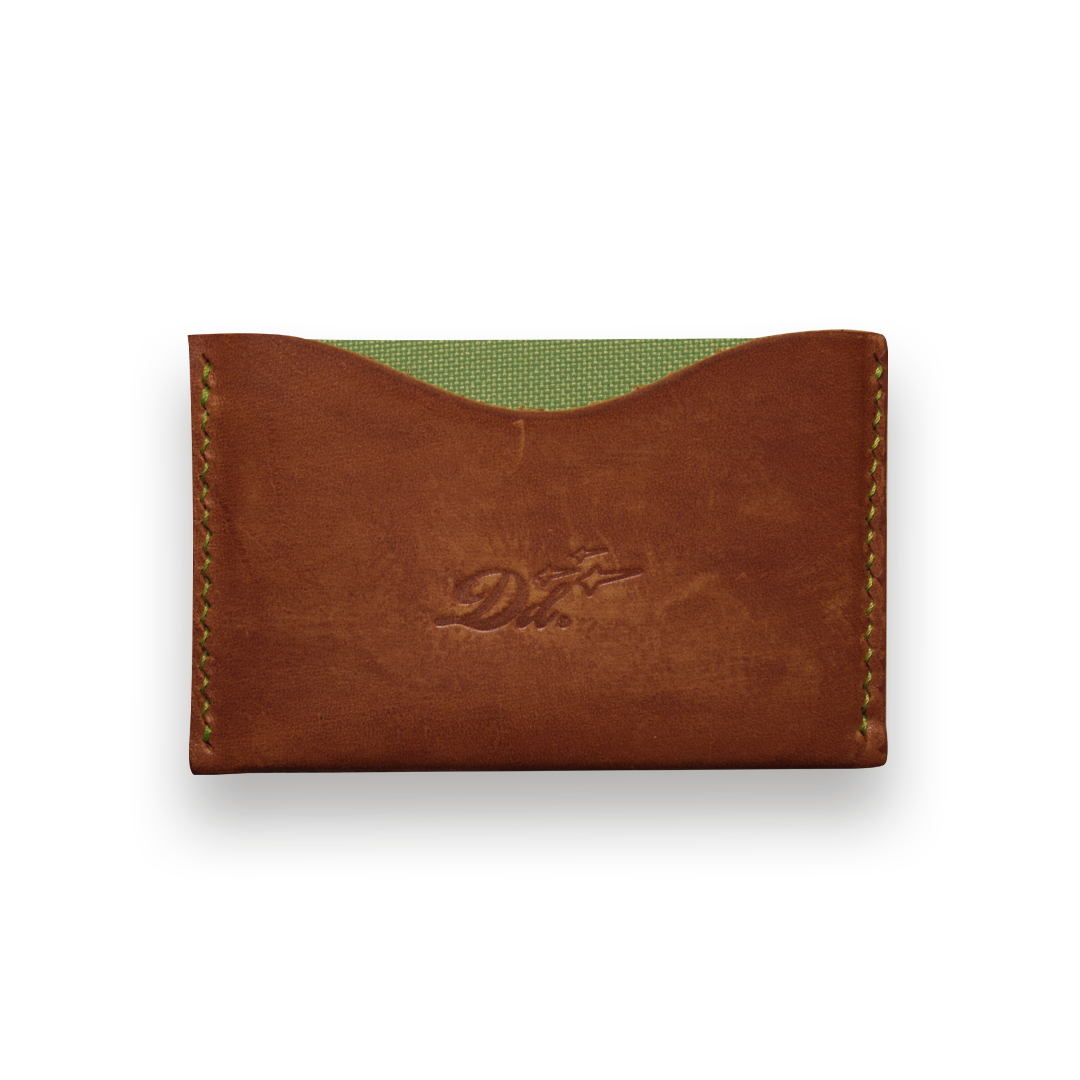 Billetera de cuero cosida a mano con separador en tela color verde menta. Contiene por un lado nuestro logo largo y por el otro el corto.