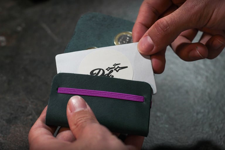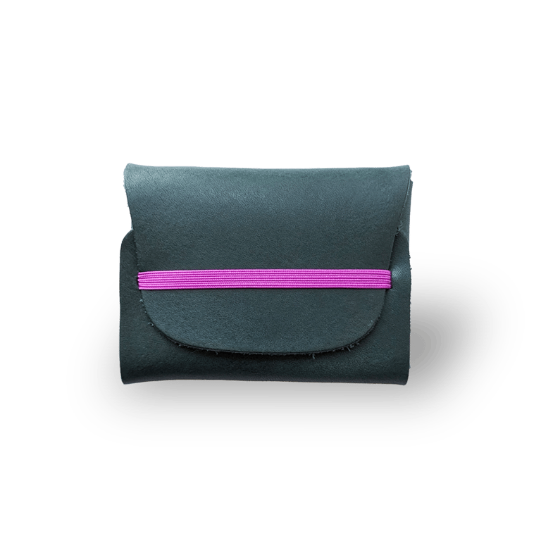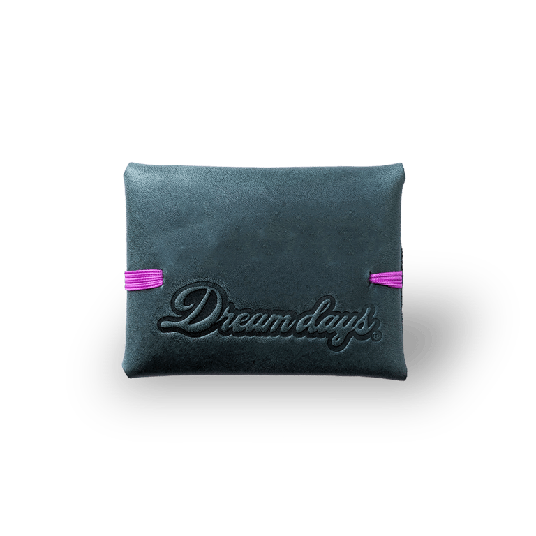 Cartera monedero en azul petróleo con banda elástica en color púrpura y logotipo largo “Dream Days” en la parte trasera. Permite guardar las tarjetas separadas de los billetes y las monedas.