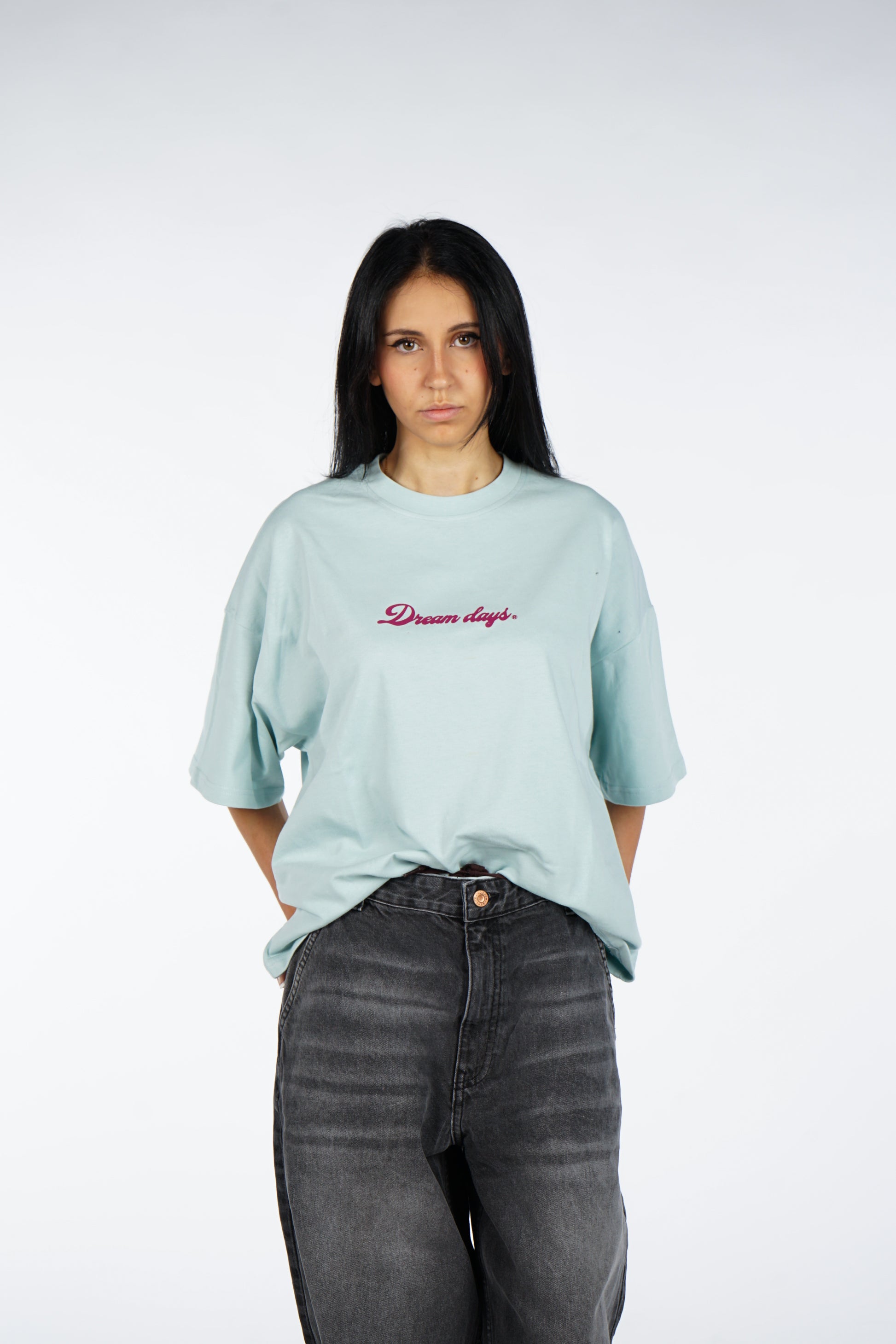 Camiseta blanca “Sweet Dreams” oversize 100% algodón (240 GSM). Logotipo largo “Dream Days” serigrafiado bajo el cuello. Diseño “Sweet Dreams” serigrafiado en la espalda.